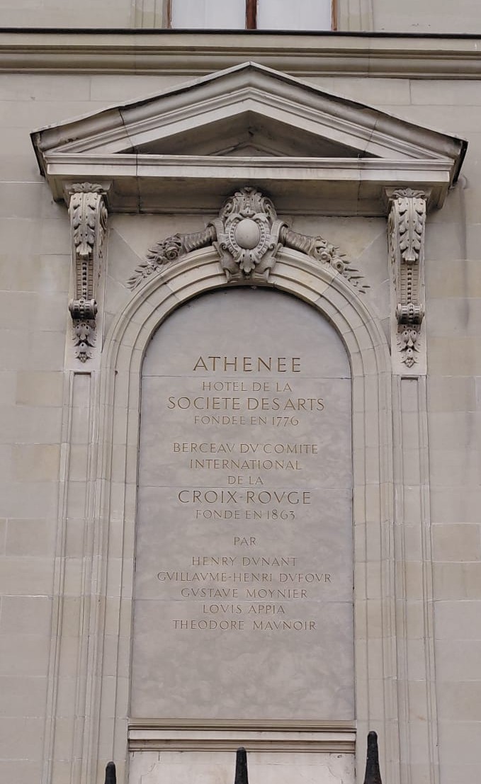 Outre le faste des salons intérieurs, les façades du Palais de l’Athénée sont un concentré d’histoire genevoise. La face sud-est ornée par une plaque commémorative pour la fondation du Comité International de la Croix-Rouge, mentionnant les principaux signataires dont Henry Dunant.